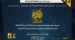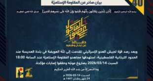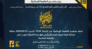 بِسْمِ اللَّـهِ الرحمن الرَّحِيمِ ﴿أُذِنَ لِلَّذِينَ يُقَاتَلُونَ بِأَنَّهُمْ ظُلِمُوا وَإِنَّ اللَّهَ عَلَىٰ نَصْرِهِمْ لَقَدِيرٌ﴾ صَدَقَ اللهُ العَلِيّ العَظِيم دفاعًا عن لبنان وشعبه، وبعد رصد قوّة لجيش العدو الإسرائيلي تقدمت إلى تلّة العويضة في بلدة العديسة عند الحدود اللبنانية الفلسطينية، استهدفها مجاهدو المُقاومة الإسلاميّة عند الساعة 18:00 السبت 14/03/2026 بصاروخ موجّه وحققوا إصابات مؤكدة. ﴿وَمَا النَّصْرُ إِلاَّ مِنْ عِندِ اللّهِ الْعَزِيزِ …