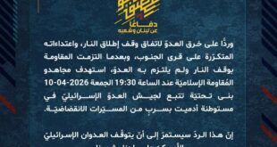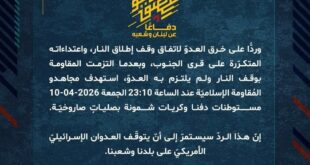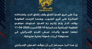 بِسْمِ اللَّـهِ الرحمن الرَّحِيمِ ﴿أُذِنَ لِلَّذِينَ يُقَاتَلُونَ بِأَنَّهُمْ ظُلِمُوا وَإِنَّ اللَّهَ عَلَىٰ نَصْرِهِمْ لَقَدِيرٌ﴾ صَدَقَ اللهُ العَلِيّ العَظِيم دفاعًا عن لبنان وشعبه، وردًّا على خرق العدوّ لاتفاق وقف إطلاق النار، واعتداءاته المتكرّرة على قرى الجنوب، وبعدما التزمت المقاومة بوقف النار ولم يلتزم به العدوّ، استهدف مجاهدو المُقاومة الإسلاميّة عند السّاعة 22:00 الجمعة 10-04-2026 مستوطنة كريات شمونة للمرّة الثانية بصليةٍ صاروخيّة. …