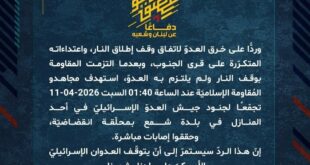 بِسْمِ اللَّـهِ الرحمن الرَّحِيمِ ﴿أُذِنَ لِلَّذِينَ يُقَاتَلُونَ بِأَنَّهُمْ ظُلِمُوا وَإِنَّ اللَّهَ عَلَىٰ نَصْرِهِمْ لَقَدِيرٌ﴾ صَدَقَ اللهُ العَلِيّ العَظِيم دفاعًا عن لبنان وشعبه، وردًّا على خرق العدوّ لاتفاق وقف إطلاق النار، واعتداءاته المتكرّرة على قرى الجنوب، وبعدما التزمت المقاومة بوقف النار ولم يلتزم به العدوّ، استهدف مجاهدو المُقاومة الإسلاميّة عند الساعة 08:10 السبت 11-04-2026 *تجمّعا لجنود وآليات جيش العدو الإسرائيلي في …