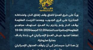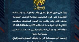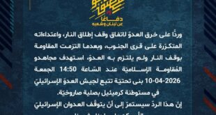 بِسْمِ اللَّـهِ الرحمن الرَّحِيمِ ﴿أُذِنَ لِلَّذِينَ يُقَاتَلُونَ بِأَنَّهُمْ ظُلِمُوا وَإِنَّ اللَّهَ عَلَىٰ نَصْرِهِمْ لَقَدِيرٌ﴾ صَدَقَ اللهُ العَلِيّ العَظِيم دفاعًا عن لبنان وشعبه، وردًّا على خرق العدوّ لاتفاق وقف إطلاق النار، واعتداءاته المتكرّرة على قرى الجنوب، وبعدما التزمت المقاومة بوقف النار ولم يلتزم به العدوّ، استهدف مجاهدو المُقاومة الإسلاميّة عند السّاعة 14:50 الجمعة 10-04-2026 بنى تحتيّة تتبع لجيش العدوّ الإسرائيليّ في …