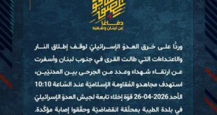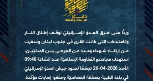 بِسْمِ اللَّـهِ الرحمن الرَّحِيمِ ﴿أُذِنَ لِلَّذِينَ يُقَاتَلُونَ بِأَنَّهُمْ ظُلِمُوا وَإِنَّ اللَّهَ عَلَىٰ نَصْرِهِمْ لَقَدِيرٌ﴾ صَدَقَ اللهُ العَلِيّ العَظِيم دفاعًا عن لبنان وشعبه، وردًّا على خرق العدوّ الإسرائيليّ لوقف إطلاق النار والاعتداءات التي طالت القرى في جنوب لبنان وأسفرت عن ارتقاء شهداء وعدد من الجرحى بين المدنيّين، استهدف مجاهدو المُقاومة الإسلاميّة عند السّاعة 09:40 الأحد 26-04-2026 تجمّعًا لجنود جيش العدوّ الإسرائيليّ …