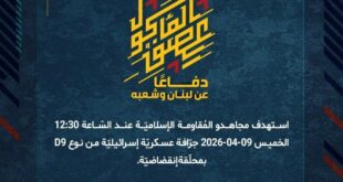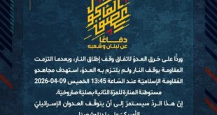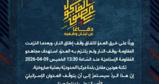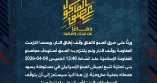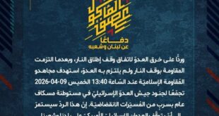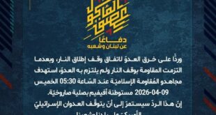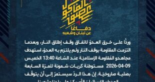 بِسْمِ اللَّـهِ الرحمن الرَّحِيمِ ﴿أُذِنَ لِلَّذِينَ يُقَاتَلُونَ بِأَنَّهُمْ ظُلِمُوا وَإِنَّ اللَّهَ عَلَىٰ نَصْرِهِمْ لَقَدِيرٌ﴾ صَدَقَ اللهُ العَلِيّ العَظِيم دفاعًا عن لبنان وشعبه، وردًّا على خرق العدوّ لاتفاق وقف إطلاق النار، وبعدما التزمت المقاومة بوقف النار ولم يلتزم به العدوّ، استهدف مجاهدو المُقاومة الإسلاميّة عند السّاعة 05:30 الخميس 09-04-2026 مستوطنة أفيفيم بصلية صاروخيّة. إنّ هذا الردّ سيستمرّ إلى أنّ يتوقّف العدوان …