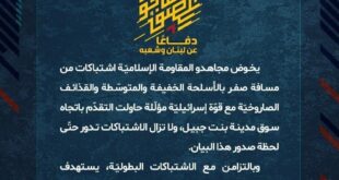 بِسْمِ اللَّـهِ الرحمن الرَّحِيمِ ﴿أُذِنَ لِلَّذِينَ يُقَاتَلُونَ بِأَنَّهُمْ ظُلِمُوا وَإِنَّ اللَّهَ عَلَىٰ نَصْرِهِمْ لَقَدِيرٌ﴾ صَدَقَ اللهُ العَلِيّ العَظِيم يخوض مجاهدو المقاومة الإسلاميّة اشتباكات بطوليّة من مسافة صفر بالأسلحة الخفيفة والمتوسّطة والقذائف الصاروخيّة مع قوّة إسرائيليّة مؤلّلة حاولت التقدّم باتجاه سوق مدينة بنت جبيل ولا تزال الإشتباكات مستمرّة حتّى لحظة صدور هذا البيان. وبالتزامن مع الاشتباكات البطوليّة، يستهدف مجاهدو المُقاومة الإسلاميّة …