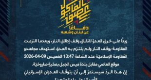 بِسْمِ اللَّـهِ الرحمن الرَّحِيمِ ﴿أُذِنَ لِلَّذِينَ يُقَاتَلُونَ بِأَنَّهُمْ ظُلِمُوا وَإِنَّ اللَّهَ عَلَىٰ نَصْرِهِمْ لَقَدِيرٌ﴾ صَدَقَ اللهُ العَلِيّ العَظِيم دفاعًا عن لبنان وشعبه، وردًّا على خرق العدوّ لاتفاق وقف إطلاق النار، وبعدما التزمت المقاومة بوقف النار ولم يلتزم به العدوّ، استهدف مجاهدو المُقاومة الإسلاميّة عند السّاعة 13:47 الخميس 09-04-2026 موقع العاصي مقابل بلدة ميس الجبل بصليةٍ صاروخيّة. إنّ هذا الردّ سيستمرّ …