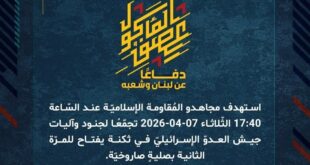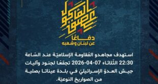 بِسْمِ اللَّـهِ الرحمن الرَّحِيمِ ﴿أُذِنَ لِلَّذِينَ يُقَاتَلُونَ بِأَنَّهُمْ ظُلِمُوا وَإِنَّ اللَّهَ عَلَىٰ نَصْرِهِمْ لَقَدِيرٌ﴾ صَدَقَ اللهُ العَلِيّ العَظِيم دفاعًا عن لبنان وشعبه، استهدف مجاهدو المُقاومة الإسلاميّة الثلاثاء 07-04-2026 تجمّعات جيش العدوّ الإسرائيليّ على النحو الآتي: الساعة 09:00 مربض مدفعيّة ديشون بصلية صاروخيّة. الساعة 10:00 محيط مدرسة مركبا بقذائف المدفعيّة. الساعة 10:00 في بلدة علما الشعب بصلية صاروخيّة. الساعة 10:00 مربض …