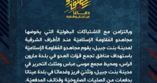 بِسْمِ اللَّـهِ الرحمن الرَّحِيمِ ﴿أُذِنَ لِلَّذِينَ يُقَاتَلُونَ بِأَنَّهُمْ ظُلِمُوا وَإِنَّ اللَّهَ عَلَىٰ نَصْرِهِمْ لَقَدِيرٌ﴾ صَدَقَ اللهُ العَلِيّ العَظِيم دفاعًا عن لبنان وشعبه، وبالتزامن مع الاشتباكات البطوليّة التي يخوضها مجاهدو المُقاومة الإسلاميّة عند الأطراف الشرقية لمدينة بنت جبيل، يقوم مجاهدو المُقاومة الإسلاميّة باستهداف مناطق تجمع قوّات العدو في بلدة مارون الراس، ومحيط مجمع موسى عباس ومثلث التحرير في مدينة بنت جبيل، …