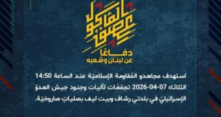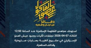 بِسْمِ اللَّـهِ الرحمن الرَّحِيمِ ﴿أُذِنَ لِلَّذِينَ يُقَاتَلُونَ بِأَنَّهُمْ ظُلِمُوا وَإِنَّ اللَّهَ عَلَىٰ نَصْرِهِمْ لَقَدِيرٌ﴾ صَدَقَ اللهُ العَلِيّ العَظِيم دفاعًا عن لبنان وشعبه، وفي إطار التحذير الذي وجّهته المُقاومة الإسلاميّة لعددٍ من مستوطنات شمال فلسطين المحتلة، ومنذ الساعة 12:00 الثلاثاء 07-04-2026 استهدف مجاهدو المُقاومة الإسلاميّة المستوطنات الآتية بعدد من الصليات الصاروخية: – الساعة 12:10 مستوطنة كريات شمونة. – الساعة 14:45 مستوطنة …