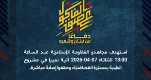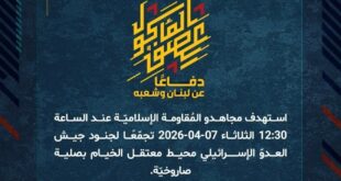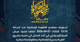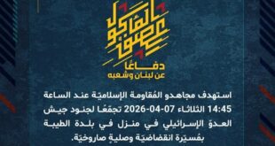 بِسْمِ اللَّـهِ الرحمن الرَّحِيمِ ﴿أُذِنَ لِلَّذِينَ يُقَاتَلُونَ بِأَنَّهُمْ ظُلِمُوا وَإِنَّ اللَّهَ عَلَىٰ نَصْرِهِمْ لَقَدِيرٌ﴾ صَدَقَ اللهُ العَلِيّ العَظِيم دفاعًا عن لبنان وشعبه، استهدف مجاهدو المُقاومة الإسلاميّة عند الساعة 13:10 الثلاثاء 07-04-2026 تجمّعًا لجنود جيش العدوّ الإسرائيلي في أحد المنازل في محيط مشروع الطيبة بمسيّرة انقضاضيّة، وحققوا إصابة مباشرة. ﴿وَمَا النَّصْرُ إِلاَّ مِنْ عِندِ اللّهِ الْعَزِيزِ الْحَكِيم﴾ الثلاثاء 07-04-2026 18 شوال …