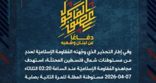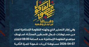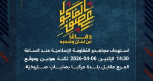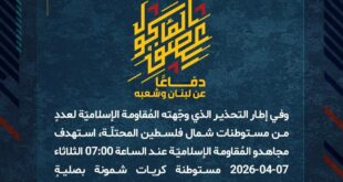 بِسْمِ اللَّـهِ الرحمن الرَّحِيمِ ﴿أُذِنَ لِلَّذِينَ يُقَاتَلُونَ بِأَنَّهُمْ ظُلِمُوا وَإِنَّ اللَّهَ عَلَىٰ نَصْرِهِمْ لَقَدِيرٌ﴾ صَدَقَ اللهُ العَلِيّ العَظِيم دفاعًا عن لبنان وشعبه، وفي إطار التحذير الذي وجّهته المُقاومة الإسلاميّة لعددٍ من مستوطنات شمال فلسطين المحتلّة، استهدف مجاهدو المُقاومة الإسلاميّة عند الساعة 08:00 الثلاثاء 07-04-2026 مستوطنة كريات شمونة للمرّة الثّانية بصليةٍ صاروخيّة. ﴿وَمَا النَّصْرُ إِلاَّ مِنْ عِندِ اللّهِ الْعَزِيزِ الْحَكِيم﴾ الثلاثاء …