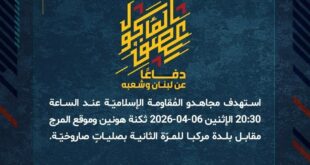 بِسْمِ اللَّـهِ الرحمن الرَّحِيمِ ﴿أُذِنَ لِلَّذِينَ يُقَاتَلُونَ بِأَنَّهُمْ ظُلِمُوا وَإِنَّ اللَّهَ عَلَىٰ نَصْرِهِمْ لَقَدِيرٌ﴾ صَدَقَ اللهُ العَلِيّ العَظِيم دفاعًا عن لبنان وشعبه، استهدف مجاهدو المُقاومة الإسلاميّة عند الساعة 17:05 الإثنين 06-04-2026 تجمّعًا لجنود جيش العدوّ الإسرائيليّ في مستوطنة كريات شمونة للمرّة الثالثة بسربٍ من المسيّرات الانقضاضيّة. ﴿وَمَا النَّصْرُ إِلاَّ مِنْ عِندِ اللّهِ الْعَزِيزِ الْحَكِيم﴾ الإثنين 06-04-2026 17 شوال 1447 هـ …