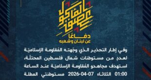 بِسْمِ اللَّـهِ الرحمن الرَّحِيمِ ﴿أُذِنَ لِلَّذِينَ يُقَاتَلُونَ بِأَنَّهُمْ ظُلِمُوا وَإِنَّ اللَّهَ عَلَىٰ نَصْرِهِمْ لَقَدِيرٌ﴾ صَدَقَ اللهُ العَلِيّ العَظِيم دفاعًا عن لبنان وشعبه، وفي إطار التحذير الذي وجّهته المُقاومة الإسلاميّة لعددٍ من مستوطنات شمال فلسطين المحتلّة، استهدف مجاهدو المُقاومة الإسلاميّة عند الساعة 02:20 الثلاثاء 07-04-2026 مستوطنة المطلة للمرة الثانية بصلية صاروخيّة. ﴿وَمَا النَّصْرُ إِلاَّ مِنْ عِندِ اللّهِ الْعَزِيزِ الْحَكِيم﴾ الثلاثاء 07-04-2026 …