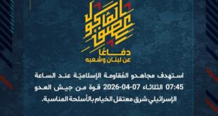 بِسْمِ اللَّـهِ الرحمن الرَّحِيمِ ﴿أُذِنَ لِلَّذِينَ يُقَاتَلُونَ بِأَنَّهُمْ ظُلِمُوا وَإِنَّ اللَّهَ عَلَىٰ نَصْرِهِمْ لَقَدِيرٌ﴾ صَدَقَ اللهُ العَلِيّ العَظِيم دفاعًا عن لبنان وشعبه، استهدف مجاهدو المُقاومة الإسلاميّة عند الساعة 07:45 الثلاثاء 07-04-2026 قوة من جيش العدو الإسرائيلي شرق معتقل الخيام بالأسلحة المناسبة. ﴿وَمَا النَّصْرُ إِلاَّ مِنْ عِندِ اللّهِ الْعَزِيزِ الْحَكِيم﴾ الثلاثاء 07-04-2026 18 شوال 1447 هـ