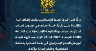 بِسْمِ اللَّـهِ الرحمن الرَّحِيمِ ﴿أُذِنَ لِلَّذِينَ يُقَاتَلُونَ بِأَنَّهُمْ ظُلِمُوا وَإِنَّ اللَّهَ عَلَىٰ نَصْرِهِمْ لَقَدِيرٌ﴾ صَدَقَ اللهُ العَلِيّ العَظِيم دفاعًا عن لبنان وشعبه، وردًّا على خرق العدوّ الإسرائيليّ لوقف إطلاق النار واستهداف سيّارة على طريق شوكين في جنوب لبنان، استهدف مجاهدو المُقاومة الإسلاميّة عند السّاعة 18:30 الجمعة 24-04-2026 آليّة هامر تابعة لجيش العدوّ الإسرائيليّ عند مدخل بلدة القنطرة بالأسلحة المناسبة وحقّقوا …