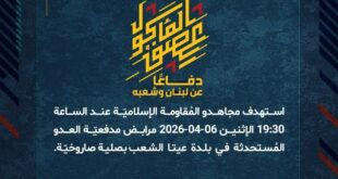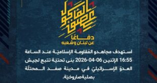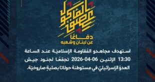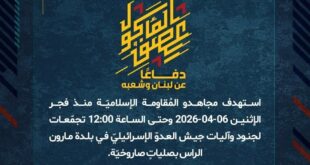 بِسْمِ اللَّـهِ الرحمن الرَّحِيمِ ﴿أُذِنَ لِلَّذِينَ يُقَاتَلُونَ بِأَنَّهُمْ ظُلِمُوا وَإِنَّ اللَّهَ عَلَىٰ نَصْرِهِمْ لَقَدِيرٌ﴾ صَدَقَ اللهُ العَلِيّ العَظِيم دفاعًا عن لبنان وشعبه، استهدف مجاهدو المُقاومة الإسلاميّة منذ فجر الإثنين 06-04-2026 وحتى الساعة 12:00 تجمّعات لجنود وآليات جيش العدوّ الإسرائيليّ في بلدة مارون الراس بصلياتٍ صاروخيّة. ﴿وَمَا النَّصْرُ إِلاَّ مِنْ عِندِ اللّهِ الْعَزِيزِ الْحَكِيم﴾ الإثنين 06-04-2026 17 شوال 1447 هـ #معركة_العصف_المأكول …