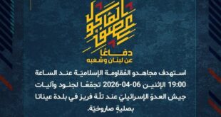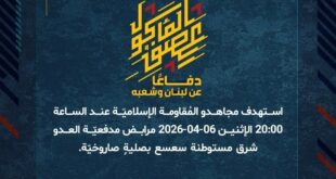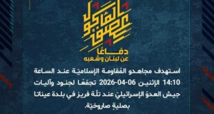 بِسْمِ اللَّـهِ الرحمن الرَّحِيمِ ﴿أُذِنَ لِلَّذِينَ يُقَاتَلُونَ بِأَنَّهُمْ ظُلِمُوا وَإِنَّ اللَّهَ عَلَىٰ نَصْرِهِمْ لَقَدِيرٌ﴾ صَدَقَ اللهُ العَلِيّ العَظِيم دفاعًا عن لبنان وشعبه، استهدف مجاهدو المُقاومة الإسلاميّة عند الساعة 19:00 الإثنين 06-04-2026 تجمّعًا لجنود وآليات جيش العدوّ الإسرائيليّ عند تلّة فريز في بلدة عيناتا بصليةٍ صاروخيّة. ﴿وَمَا النَّصْرُ إِلاَّ مِنْ عِندِ اللّهِ الْعَزِيزِ الْحَكِيم﴾ الإثنين 06-04-2026 17 شوال 1447 هـ #معركة_العصف_المأكول …