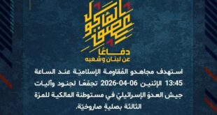 بِسْمِ اللَّـهِ الرحمن الرَّحِيمِ ﴿أُذِنَ لِلَّذِينَ يُقَاتَلُونَ بِأَنَّهُمْ ظُلِمُوا وَإِنَّ اللَّهَ عَلَىٰ نَصْرِهِمْ لَقَدِيرٌ﴾ صَدَقَ اللهُ العَلِيّ العَظِيم دفاعًا عن لبنان وشعبه، استهدف مجاهدو المُقاومة الإسلاميّة عند الساعة 19:20 الإثنين 06-04-2026 تجمّعًا لجنود جيش العدوّ الإسرائيليّ في مستوطنة المالكية للمرّة الثانية بسربٍ من المسيّرات الانقضاضيّة. ﴿وَمَا النَّصْرُ إِلاَّ مِنْ عِندِ اللّهِ الْعَزِيزِ الْحَكِيم﴾ الإثنين 06-04-2026 17 شوال 1447 هـ