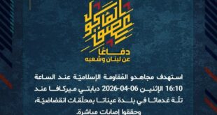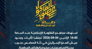 بِسْمِ اللَّـهِ الرحمن الرَّحِيمِ ﴿أُذِنَ لِلَّذِينَ يُقَاتَلُونَ بِأَنَّهُمْ ظُلِمُوا وَإِنَّ اللَّهَ عَلَىٰ نَصْرِهِمْ لَقَدِيرٌ﴾ صَدَقَ اللهُ العَلِيّ العَظِيم دفاعًا عن لبنان وشعبه، استهدف مجاهدو المُقاومة الإسلاميّة عند الساعة 16:40 الإثنين 06-04-2026 تجمّعًا لآليات وجنود جيش العدوّ الإسرائيليّ في تلّة الحمامص جنوب مدينة الخيام بصلياتٍ صاروخيّة وقذائف المدفعيّة. ﴿وَمَا النَّصْرُ إِلاَّ مِنْ عِندِ اللّهِ الْعَزِيزِ الْحَكِيم﴾ الإثنين 06-04-2026 17 شوال 1447 …