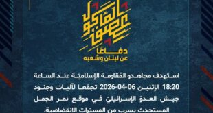 بِسْمِ اللَّـهِ الرحمن الرَّحِيمِ ﴿أُذِنَ لِلَّذِينَ يُقَاتَلُونَ بِأَنَّهُمْ ظُلِمُوا وَإِنَّ اللَّهَ عَلَىٰ نَصْرِهِمْ لَقَدِيرٌ﴾ صَدَقَ اللهُ العَلِيّ العَظِيم دفاعًا عن لبنان وشعبه، استهدف مجاهدو المُقاومة الإسلاميّة عند الساعة 18:20 الإثنين 06-04-2026 تجمّعا لآليات وجنود جيش العدوّ الإسرائيليّ في موقع نمر الجمل المستحدث بسرب من المسيّرات الانقضاضية. ﴿وَمَا النَّصْرُ إِلاَّ مِنْ عِندِ اللّهِ الْعَزِيزِ الْحَكِيم﴾ الإثنين 06-04-2026 17 شوال 1447 هـ …
