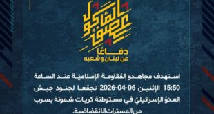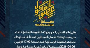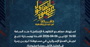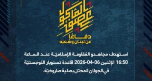 بِسْمِ اللَّـهِ الرحمن الرَّحِيمِ ﴿أُذِنَ لِلَّذِينَ يُقَاتَلُونَ بِأَنَّهُمْ ظُلِمُوا وَإِنَّ اللَّهَ عَلَىٰ نَصْرِهِمْ لَقَدِيرٌ﴾ صَدَقَ اللهُ العَلِيّ العَظِيم دفاعًا عن لبنان وشعبه، وفي إطار التحذير الذي وجّهته المُقاومة الإسلاميّة لعددٍ من مستوطنات شمال فلسطين المحتلّة، استهدف مجاهدو المُقاومة الإسلاميّة عند الساعة 17:00 الإثنين 06-04-2026 مستوطنة كريات شمونة بصلية صاروخيّة. ﴿وَمَا النَّصْرُ إِلاَّ مِنْ عِندِ اللّهِ الْعَزِيزِ الْحَكِيم﴾ الإثنين 06-04-2026 17 …