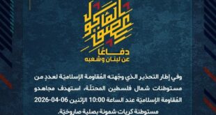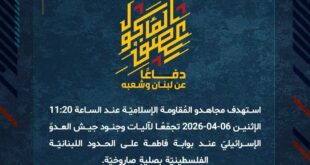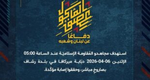 بِسْمِ اللَّـهِ الرحمن الرَّحِيمِ ﴿أُذِنَ لِلَّذِينَ يُقَاتَلُونَ بِأَنَّهُمْ ظُلِمُوا وَإِنَّ اللَّهَ عَلَىٰ نَصْرِهِمْ لَقَدِيرٌ﴾ صَدَقَ اللهُ العَلِيّ العَظِيم دفاعًا عن لبنان وشعبه، استهدف مجاهدو المُقاومة الإسلاميّة فجر اليوم الإثنين 06-04-2026 تجمّعًات لآليات وجنود جيش العدوّ الإسرائيليّ بصلياتٍ صاروخيّة على النحو الآتي: – الساعة 00:15 في تلّة السدر في بلدة عيناتا. – الساعة 00:15 في بلدة مارون الراس. – الساعة 01:30 …