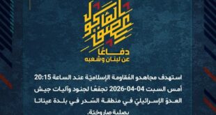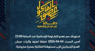 بِسْمِ اللَّـهِ الرحمن الرَّحِيمِ ﴿أُذِنَ لِلَّذِينَ يُقَاتَلُونَ بِأَنَّهُمْ ظُلِمُوا وَإِنَّ اللَّهَ عَلَىٰ نَصْرِهِمْ لَقَدِيرٌ﴾ صَدَقَ اللهُ العَلِيّ العَظِيم دفاعًا عن لبنان وشعبه، استهدف مجاهدو المُقاومة الإسلاميّة عند الساعة 20:15 أمس السبت 04-04-2026 تجمّعًا لجنود وآليات جيش العدوّ الإسرائيليّ في منطقة السّدر في بلدة عيناتا بصليةٍ صاروخيّة. ﴿وَمَا النَّصْرُ إِلاَّ مِنْ عِندِ اللّهِ الْعَزِيزِ الْحَكِيم﴾ الأحد 05-04-2026 16 شوال 1447 هـ …