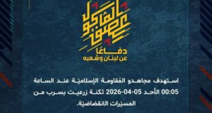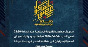 بِسْمِ اللَّـهِ الرحمن الرَّحِيمِ ﴿أُذِنَ لِلَّذِينَ يُقَاتَلُونَ بِأَنَّهُمْ ظُلِمُوا وَإِنَّ اللَّهَ عَلَىٰ نَصْرِهِمْ لَقَدِيرٌ﴾ صَدَقَ اللهُ العَلِيّ العَظِيم دفاعًا عن لبنان وشعبه، استهدف مجاهدو المُقاومة الإسلاميّة عند الساعة 23:30 أمس السبت 04-04-2026 تجمّعًا لجنود وآليات جيش العدوّ الإسرائيليّ في منطقة السّدر في بلدة عيناتا بصليةٍ صاروخيّة. ﴿وَمَا النَّصْرُ إِلاَّ مِنْ عِندِ اللّهِ الْعَزِيزِ الْحَكِيم﴾ الأحد 05-04-2026 16 شوال 1447 هـ …