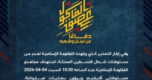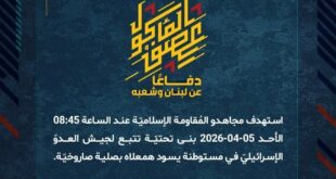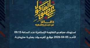 بِسْمِ اللَّـهِ الرحمن الرَّحِيمِ ﴿أُذِنَ لِلَّذِينَ يُقَاتَلُونَ بِأَنَّهُمْ ظُلِمُوا وَإِنَّ اللَّهَ عَلَىٰ نَصْرِهِمْ لَقَدِيرٌ﴾ صَدَقَ اللهُ العَلِيّ العَظِيم دفاعًا عن لبنان وشعبه، وفي إطار التحذير الذي وجّهته المُقاومة الإسلاميّة لعددٍ من مستوطنات شمال فلسطين المحتلة، استهدف مجاهدو المُقاومة الإسلاميّة عند الساعة 10:30 السبت 04-04-2026 مستوطنتي أفيفيم ويرؤون بصلياتٍ صاروخيّة. ﴿وَمَا النَّصْرُ إِلاَّ مِنْ عِندِ اللّهِ الْعَزِيزِ الْحَكِيم﴾ السبت 04-04-2026 15 …
