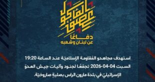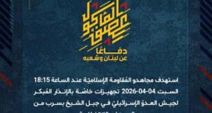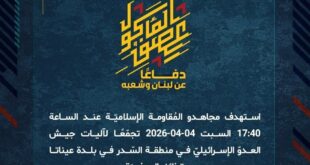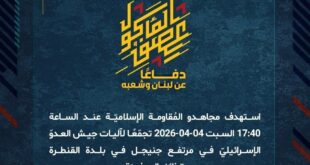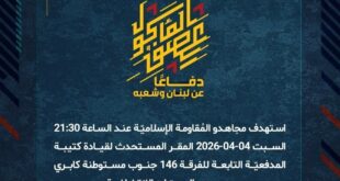 بِسْمِ اللَّـهِ الرحمن الرَّحِيمِ ﴿أُذِنَ لِلَّذِينَ يُقَاتَلُونَ بِأَنَّهُمْ ظُلِمُوا وَإِنَّ اللَّهَ عَلَىٰ نَصْرِهِمْ لَقَدِيرٌ﴾ صَدَقَ اللهُ العَلِيّ العَظِيم دفاعًا عن لبنان وشعبه، استهدف مجاهدو المُقاومة الإسلاميّة عند الساعة 21:30 السبت 04-04-2026 المقر المستحدث لقيادة كتيبة المدفعيّة التابعة للفرقة 146 جنوب مستوطنة كابري بسربٍ من المسيّرات الانقضاضية. ﴿وَمَا النَّصْرُ إِلاَّ مِنْ عِندِ اللّهِ الْعَزِيزِ الْحَكِيم﴾ السبت 04-04-2026 15 شوال 1447 هـ …