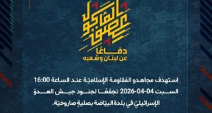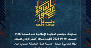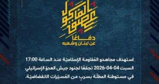 بِسْمِ اللَّـهِ الرحمن الرَّحِيمِ ﴿أُذِنَ لِلَّذِينَ يُقَاتَلُونَ بِأَنَّهُمْ ظُلِمُوا وَإِنَّ اللَّهَ عَلَىٰ نَصْرِهِمْ لَقَدِيرٌ﴾ صَدَقَ اللهُ العَلِيّ العَظِيم دفاعًا عن لبنان وشعبه، استهدف مجاهدو المُقاومة الإسلاميّة عند الساعة 14:00 السبت 04-04-2026 قاعدة شراغا (المقر الإداري لقيادة لواء غولاني) شمال مدينة عكّا المُحتلّة بسربٍ من المسيّرات الانقضاضيّة. ﴿وَمَا النَّصْرُ إِلاَّ مِنْ عِندِ اللّهِ الْعَزِيزِ الْحَكِيم﴾ السبت 04-04-2026 15 شوال 1447 هـ …