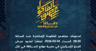 بِسْمِ اللَّـهِ الرحمن الرَّحِيمِ ﴿أُذِنَ لِلَّذِينَ يُقَاتَلُونَ بِأَنَّهُمْ ظُلِمُوا وَإِنَّ اللَّهَ عَلَىٰ نَصْرِهِمْ لَقَدِيرٌ﴾ صَدَقَ اللهُ العَلِيّ العَظِيم دفاعًا عن لبنان وشعبه، استهدف مجاهدو المُقاومة الإسلاميّة عند الساعة 08:20 السبت 04-04-2026 تجمّعًا لجنود جيش العدوّ الإسرائيليّ في محيط موقع السمّاقة في تلال كفرشوبا المُحتلّة بسربٍ من المسيّرات الانقضاضيّة. ﴿وَمَا النَّصْرُ إِلاَّ مِنْ عِندِ اللّهِ الْعَزِيزِ الْحَكِيم﴾ السبت 04-04-2026 15 شوال …