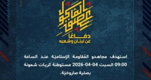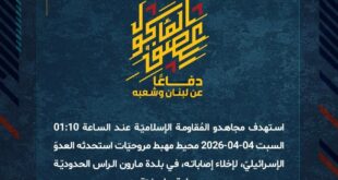 بِسْمِ اللَّـهِ الرحمن الرَّحِيمِ ﴿أُذِنَ لِلَّذِينَ يُقَاتَلُونَ بِأَنَّهُمْ ظُلِمُوا وَإِنَّ اللَّهَ عَلَىٰ نَصْرِهِمْ لَقَدِيرٌ﴾ صَدَقَ اللهُ العَلِيّ العَظِيم دفاعًا عن لبنان وشعبه، استهدف مجاهدو المُقاومة الإسلاميّة عند الساعة 01:10 السبت 04-04-2026 محيط مهبط مروحيّات استحدثه العدوّ الإسرائيليّ، لإخلاء إصاباته، في بلدة مارون الراس الحدوديّة بصلية صاروخيّة. ﴿وَمَا النَّصْرُ إِلاَّ مِنْ عِندِ اللّهِ الْعَزِيزِ الْحَكِيم﴾ السبت 04-04-2026 15 شوال 1447 هـ …