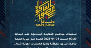 بِسْمِ اللَّـهِ الرحمن الرَّحِيمِ ﴿أُذِنَ لِلَّذِينَ يُقَاتَلُونَ بِأَنَّهُمْ ظُلِمُوا وَإِنَّ اللَّهَ عَلَىٰ نَصْرِهِمْ لَقَدِيرٌ﴾ صَدَقَ اللهُ العَلِيّ العَظِيم دفاعًا عن لبنان وشعبه، استهدف مجاهدو المُقاومة الإسلاميّة عند الساعة 07:20 السبت 04-04-2026 قاعدة جبل نيريا التابعة لقاعدة ميرون للمراقبة وإدارة العمليّات الجويّة شمال فلسطين المحتلّة بصلية صاروخية. ﴿وَمَا النَّصْرُ إِلاَّ مِنْ عِندِ اللّهِ الْعَزِيزِ الْحَكِيم﴾ السبت 04-04-2026 15 شوال 1447 هـ …
