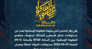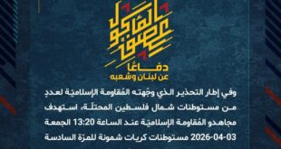 بِسْمِ اللَّـهِ الرحمن الرَّحِيمِ ﴿أُذِنَ لِلَّذِينَ يُقَاتَلُونَ بِأَنَّهُمْ ظُلِمُوا وَإِنَّ اللَّهَ عَلَىٰ نَصْرِهِمْ لَقَدِيرٌ﴾ صَدَقَ اللهُ العَلِيّ العَظِيم دفاعًا عن لبنان وشعبه، وفي إطار التحذير الذي وجّهته المُقاومة الإسلاميّة لعددٍ من مستوطنات شمال فلسطين المحتلّة، استهدف مجاهدو المُقاومة الإسلاميّة بين الساعة 09:00 والساعة 09:15 الجمعة 03-04-2026 مستوطنات الحولة، المطلّة ومعيان باروخ بصليات صاروخيّة. ﴿وَمَا النَّصْرُ إِلاَّ مِنْ عِندِ اللّهِ الْعَزِيزِ …
