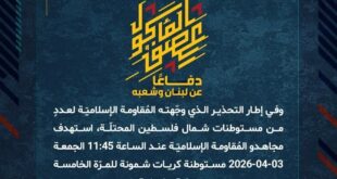 بِسْمِ اللَّـهِ الرحمن الرَّحِيمِ ﴿أُذِنَ لِلَّذِينَ يُقَاتَلُونَ بِأَنَّهُمْ ظُلِمُوا وَإِنَّ اللَّهَ عَلَىٰ نَصْرِهِمْ لَقَدِيرٌ﴾ صَدَقَ اللهُ العَلِيّ العَظِيم دفاعًا عن لبنان وشعبه، وفي إطار التحذير الذي وجّهته المُقاومة الإسلاميّة لعددٍ من مستوطنات شمال فلسطين المحتلّة، استهدف مجاهدو المُقاومة الإسلاميّة عند الساعة 11:45 الجمعة 03-04-2026 مستوطنة كريات شمونة للمرّة الخامسة بصلية صاروخيّة. ﴿وَمَا النَّصْرُ إِلاَّ مِنْ عِندِ اللّهِ الْعَزِيزِ الْحَكِيم﴾ الجمعة …
