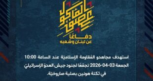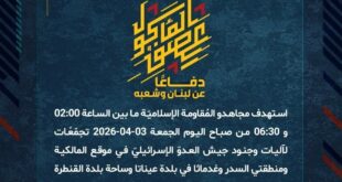 بِسْمِ اللَّـهِ الرحمن الرَّحِيمِ ﴿أُذِنَ لِلَّذِينَ يُقَاتَلُونَ بِأَنَّهُمْ ظُلِمُوا وَإِنَّ اللَّهَ عَلَىٰ نَصْرِهِمْ لَقَدِيرٌ﴾ صَدَقَ اللهُ العَلِيّ العَظِيم دفاعًا عن لبنان وشعبه، استهدف مجاهدو المُقاومة الإسلاميّة ما بين الساعة 02:00 و 06:30 من صباح اليوم الجمعة 03-04-2026 تجمّعًات لآليات وجنود جيش العدوّ الإسرائيليّ في موقع المالكية ومنطقتي السدر وغدماثا في بلدة عيناتا وساحة بلدة القنطرة بصليات صاروخيّة وقذائف المدفعيّة على …