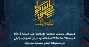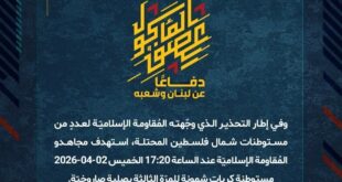 بِسْمِ اللَّـهِ الرحمن الرَّحِيمِ ﴿أُذِنَ لِلَّذِينَ يُقَاتَلُونَ بِأَنَّهُمْ ظُلِمُوا وَإِنَّ اللَّهَ عَلَىٰ نَصْرِهِمْ لَقَدِيرٌ﴾ صَدَقَ اللهُ العَلِيّ العَظِيم دفاعًا عن لبنان وشعبه، وردًّا على تمادي العدوّ في قصف المدنيّين والتهجير وهدم البيوت، استهدف مجاهدو المُقاومة الإسلاميّة عند الساعة 19:15 الخميس 02-04-2026 قاعدة عميعاد وقاعدة فيلون شمال بحيرة طبريا بصلية صاروخيّة. ﴿وَمَا النَّصْرُ إِلاَّ مِنْ عِندِ اللّهِ الْعَزِيزِ الْحَكِيم﴾ الخميس 02-04-2026 …