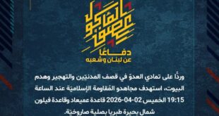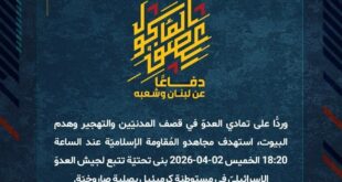بِسْمِ اللَّـهِ الرحمن الرَّحِيمِ ﴿أُذِنَ لِلَّذِينَ يُقَاتَلُونَ بِأَنَّهُمْ ظُلِمُوا وَإِنَّ اللَّهَ عَلَىٰ نَصْرِهِمْ لَقَدِيرٌ﴾ صَدَقَ اللهُ العَلِيّ العَظِيم دفاعًا عن لبنان وشعبه، وفي إطار التحذير الذي وجّهته المُقاومة الإسلاميّة لعددٍ من مستوطنات شمال فلسطين المحتلة، استهدف مجاهدو المُقاومة الإسلاميّة عند الساعة 17:20 الخميس 02-04-2026 مستوطنة كريات شمونة للمرّة الثالثة بصلية صاروخيّة. ﴿وَمَا النَّصْرُ إِلاَّ مِنْ عِندِ اللّهِ الْعَزِيزِ الْحَكِيم﴾ الخميس …