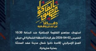 بِسْمِ اللَّـهِ الرحمن الرَّحِيمِ ﴿أُذِنَ لِلَّذِينَ يُقَاتَلُونَ بِأَنَّهُمْ ظُلِمُوا وَإِنَّ اللَّهَ عَلَىٰ نَصْرِهِمْ لَقَدِيرٌ﴾ صَدَقَ اللهُ العَلِيّ العَظِيم دفاعًا عن لبنان وشعبه، استهدف مجاهدو المُقاومة الإسلاميّة عند الساعة 10:30 الخميس 02-04-2026 مقر قيادة المنطقة الشماليّة في جيش العدوّ الإسرائيلي (قاعدة دادو) شمال مدينة صفد المحتلّة بصلية صاروخيّة. ﴿وَمَا النَّصْرُ إِلاَّ مِنْ عِندِ اللّهِ الْعَزِيزِ الْحَكِيم﴾ الخميس 02-04-2026 13 شوال 1447 …