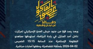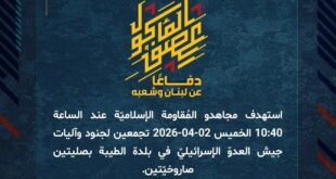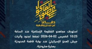 بِسْمِ اللَّـهِ الرحمن الرَّحِيمِ ﴿أُذِنَ لِلَّذِينَ يُقَاتَلُونَ بِأَنَّهُمْ ظُلِمُوا وَإِنَّ اللَّهَ عَلَىٰ نَصْرِهِمْ لَقَدِيرٌ﴾ صَدَقَ اللهُ العَلِيّ العَظِيم دفاعًا عن لبنان وشعبه، وبعد رصد قوّةٍ من جنود جيش العدوّ الإسرائيلي تمركزت داخل أحد المنازل في بلدة البيّاضة، استهدفها مجاهدو المُقاومة الإسلاميّة عند الساعة 15:15 الخميس 02-04-2026 بمُحلّقة انقضاضيّة، وحققوا أصابات مباشرة. ﴿وَمَا النَّصْرُ إِلاَّ مِنْ عِندِ اللّهِ الْعَزِيزِ الْحَكِيم﴾ الخميس …