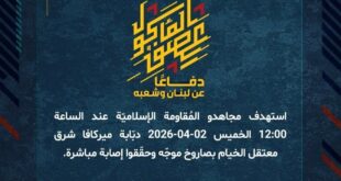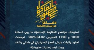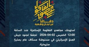 بِسْمِ اللَّـهِ الرحمن الرَّحِيمِ ﴿أُذِنَ لِلَّذِينَ يُقَاتَلُونَ بِأَنَّهُمْ ظُلِمُوا وَإِنَّ اللَّهَ عَلَىٰ نَصْرِهِمْ لَقَدِيرٌ﴾ صَدَقَ اللهُ العَلِيّ العَظِيم دفاعًا عن لبنان وشعبه، استهدف مجاهدو المُقاومة الإسلاميّة ما بين الساعة 10:00 و 11:00 الخميس 02-04-2026 تجمّعات لجنود وآليات جيش العدوّ الإسرائيليّ في بلدتي رشاف وبيت ليف بصليات صاروخيّة. ﴿وَمَا النَّصْرُ إِلاَّ مِنْ عِندِ اللّهِ الْعَزِيزِ الْحَكِيم﴾ الخميس 02-04-2026 13 شوال …