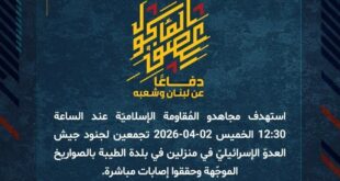 بِسْمِ اللَّـهِ الرحمن الرَّحِيمِ ﴿أُذِنَ لِلَّذِينَ يُقَاتَلُونَ بِأَنَّهُمْ ظُلِمُوا وَإِنَّ اللَّهَ عَلَىٰ نَصْرِهِمْ لَقَدِيرٌ﴾ صَدَقَ اللهُ العَلِيّ العَظِيم دفاعًا عن لبنان وشعبه، استهدف مجاهدو المُقاومة الإسلاميّة عند الساعة 12:30 الخميس 02-04-2026 تجمعين لجنود جيش العدوّ الإسرائيليّ في منزلين في بلدة الطيبة بالصواريخ الموجّهة وحققوا إصابات مباشرة. ﴿وَمَا النَّصْرُ إِلاَّ مِنْ عِندِ اللّهِ الْعَزِيزِ الْحَكِيم﴾ الخميس 02-04-2026 13 شوال 1447 هـ …