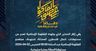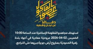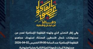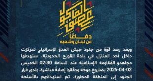 بِسْمِ اللَّـهِ الرحمن الرَّحِيمِ ﴿أُذِنَ لِلَّذِينَ يُقَاتَلُونَ بِأَنَّهُمْ ظُلِمُوا وَإِنَّ اللَّهَ عَلَىٰ نَصْرِهِمْ لَقَدِيرٌ﴾ صَدَقَ اللهُ العَلِيّ العَظِيم دفاعًا عن لبنان وشعبه، وبعد رصد قوّةٍ من جنود جيش العدوّ الإسرائيلي تمركزت داخل أحد المنازل في بلدة القوزح الحدوديّة، استهدفها مجاهدو المُقاومة الإسلاميّة عند الساعة 02:30 الخميس 02-04-2026 بصاروخٍ موجّه وحقّقوا إصابةً مباشرة. ولدى فرار الجنود إلى المنطقة المجاورة، تم استهدافهم …