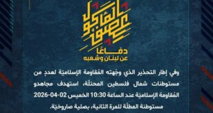 بِسْمِ اللَّـهِ الرحمن الرَّحِيمِ ﴿أُذِنَ لِلَّذِينَ يُقَاتَلُونَ بِأَنَّهُمْ ظُلِمُوا وَإِنَّ اللَّهَ عَلَىٰ نَصْرِهِمْ لَقَدِيرٌ﴾ صَدَقَ اللهُ العَلِيّ العَظِيم دفاعًا عن لبنان وشعبه، وفي إطار التحذير الذي وجّهته المُقاومة الإسلاميّة لعددٍ من مستوطنات شمال فلسطين المحتلة، استهدف مجاهدو المُقاومة الإسلاميّة عند الساعة 09:00 الخميس 02-04-2026 مستوطنة كريات شمونة للمرّة الثانية بصلية صاروخية. ﴿وَمَا النَّصْرُ إِلاَّ مِنْ عِندِ اللّهِ الْعَزِيزِ الْحَكِيم﴾ …