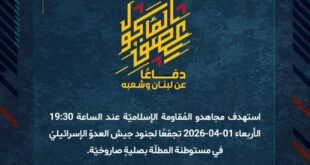 بِسْمِ اللَّـهِ الرحمن الرَّحِيمِ ﴿أُذِنَ لِلَّذِينَ يُقَاتَلُونَ بِأَنَّهُمْ ظُلِمُوا وَإِنَّ اللَّهَ عَلَىٰ نَصْرِهِمْ لَقَدِيرٌ﴾ صَدَقَ اللهُ العَلِيّ العَظِيم دفاعًا عن لبنان وشعبه، استهدف مجاهدو المُقاومة الإسلاميّة عند الساعة 18:00 الأربعاء 01-04-2026 تجمّعًا لجنود جيش العدوّ الإسرائيليّ في ثكنة أفيفيم بصليةٍ صاروخيّة. ﴿وَمَا النَّصْرُ إِلاَّ مِنْ عِندِ اللّهِ الْعَزِيزِ الْحَكِيم﴾ الأربعاء 01-04-2026 12 شوال 1447 هـ #معركة_العصف_المأكول #دفاعا_عن_لبنان_وشعبه