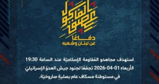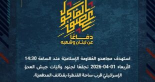 بِسْمِ اللَّـهِ الرحمن الرَّحِيمِ ﴿أُذِنَ لِلَّذِينَ يُقَاتَلُونَ بِأَنَّهُمْ ظُلِمُوا وَإِنَّ اللَّهَ عَلَىٰ نَصْرِهِمْ لَقَدِيرٌ﴾ صَدَقَ اللهُ العَلِيّ العَظِيم دفاعًا عن لبنان وشعبه، استهدف مجاهدو المُقاومة الإسلاميّة عند الساعة 14:30 الأربعاء 01-04-2026 تجمّعًا لجنود وآليّات جيش العدوّ الإسرائيليّ قرب ساحة القنطرة بقذائف المدفعيّة. ﴿وَمَا النَّصْرُ إِلاَّ مِنْ عِندِ اللّهِ الْعَزِيزِ الْحَكِيم﴾ الأربعاء 01-04-2026 12 شوال 1447 هـ #معركة_العصف_المأكول #دفاعا_عن_لبنان_وشعبه