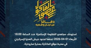 بِسْمِ اللَّـهِ الرحمن الرَّحِيمِ ﴿أُذِنَ لِلَّذِينَ يُقَاتَلُونَ بِأَنَّهُمْ ظُلِمُوا وَإِنَّ اللَّهَ عَلَىٰ نَصْرِهِمْ لَقَدِيرٌ﴾ صَدَقَ اللهُ العَلِيّ العَظِيم دفاعًا عن لبنان وشعبه، استهدف مجاهدو المُقاومة الإسلاميّة عند الساعة 18:00 الأربعاء 01-04-2026 تجمّعًا لجنود جيش العدوّ الإسرائيليّ في محيط موقع المالكيّة بصليةٍ صاروخيّة. ﴿وَمَا النَّصْرُ إِلاَّ مِنْ عِندِ اللّهِ الْعَزِيزِ الْحَكِيم﴾ الأربعاء 01-04-2026 12 شوال 1447 هـ #معركة_العصف_المأكول #دفاعا_عن_لبنان_وشعبه