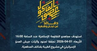 بِسْمِ اللَّـهِ الرحمن الرَّحِيمِ ﴿أُذِنَ لِلَّذِينَ يُقَاتَلُونَ بِأَنَّهُمْ ظُلِمُوا وَإِنَّ اللَّهَ عَلَىٰ نَصْرِهِمْ لَقَدِيرٌ﴾ صَدَقَ اللهُ العَلِيّ العَظِيم دفاعًا عن لبنان وشعبه، استهدف مجاهدو المُقاومة الإسلاميّة عند الساعة 16:00 الأربعاء 01-04-2026 تجمّعًا لجنود وآليّات جيش العدوّ الإسرائيليّ في مشروع الطيبة بقذائف المدفعيّة. ﴿وَمَا النَّصْرُ إِلاَّ مِنْ عِندِ اللّهِ الْعَزِيزِ الْحَكِيم﴾ الأربعاء 01-04-2026 12 شوال 1447 هـ #معركة_العصف_المأكول #دفاعا_عن_لبنان_وشعبه