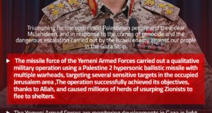 المتحدث الرسمي للقوات المسلحة اليمنية العميد/ يحيى سريع قاسم سريع بسمِ اللهِ الرحمنِ الرحيمِ قال تعالى: { یَـٰۤأَیُّهَا ٱلَّذِینَ ءَامَنُوۤا۟ إِن تَنصُرُوا۟ ٱللَّهَ یَنصُرۡكُمۡ وَیُثَبِّتۡ أَقۡدَامَكُمۡ } صدقَ اللهُ العظيم انتصاراً لمظلوميةِ الشعبِ الفلسطينيِّ ومجاهديهِ الأعزاءِ، ورداً على جرائمِ الإبادةِ الجماعيةِ والتصعيد الخطير الذي يقوم به العدوُّ الإسرائيليُّ بحقِّ إخوانِنا في قطاعِ غزة. وفي إطارِ الردِّ على العدوانِ الإسرائيليِّ على …