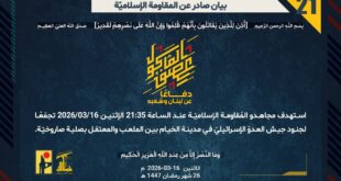 بِسْمِ اللَّـهِ الرحمن الرَّحِيمِ ﴿أُذِنَ لِلَّذِينَ يُقَاتَلُونَ بِأَنَّهُمْ ظُلِمُوا وَإِنَّ اللَّهَ عَلَىٰ نَصْرِهِمْ لَقَدِيرٌ﴾ صَدَقَ اللهُ العَلِيّ العَظِيم دفاعًا عن لبنان وشعبه، استهدف مجاهدو المُقاومة الإسلاميّة عند الساعة 21:35 الإثنين 16/03/2026 تجمّعًا لجنود جيش العدوّ الإسرائيليّ في مدينة الخيام بين الملعب والمعتقل بصلية صاروخيّة. ﴿وَمَا النَّصْرُ إِلاَّ مِنْ عِندِ اللّهِ الْعَزِيزِ الْحَكِيم﴾ الاثنين 16-03-2026 26 رمضان 1447 هـ