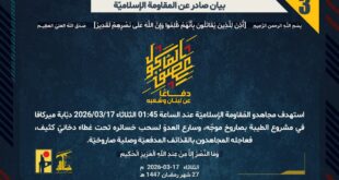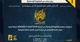 بِسْمِ اللَّـهِ الرحمن الرَّحِيمِ ﴿أُذِنَ لِلَّذِينَ يُقَاتَلُونَ بِأَنَّهُمْ ظُلِمُوا وَإِنَّ اللَّهَ عَلَىٰ نَصْرِهِمْ لَقَدِيرٌ﴾ صَدَقَ اللهُ العَلِيّ العَظِيم دفاعًا عن لبنان وشعبه، استهدف مجاهدو المُقاومة الإسلاميّة مجدّدًا عند الساعة 02:00 الثلاثاء 17/03/2026 دبّابة ميركافا ثانية في منطقة مشروع الطيبة بصاروخ موجّه وأصابوها إصابة مباشرة، ليرتفع عدد الدبّابات المستهدفة إلى 5 منذ ليل أمس. ﴿وَمَا النَّصْرُ إِلاَّ مِنْ عِندِ اللّهِ الْعَزِيزِ …